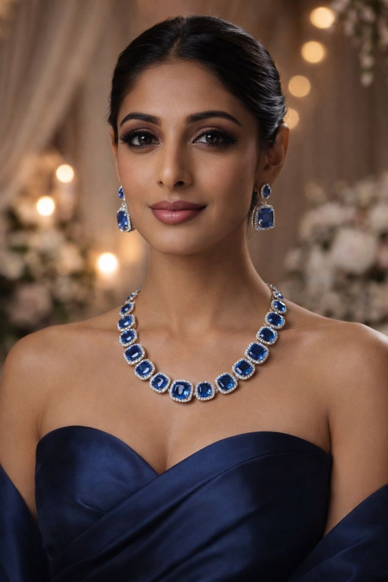 Discover the elegance of the Azura Halo Sapphire Necklace Set, a luxury jewelry piece crafted with rich blue sapphire-toned stones and precision diamond-look halo detailing. This designer necklace set is perfect for weddings, receptions, cocktail parties, and evening occasions.