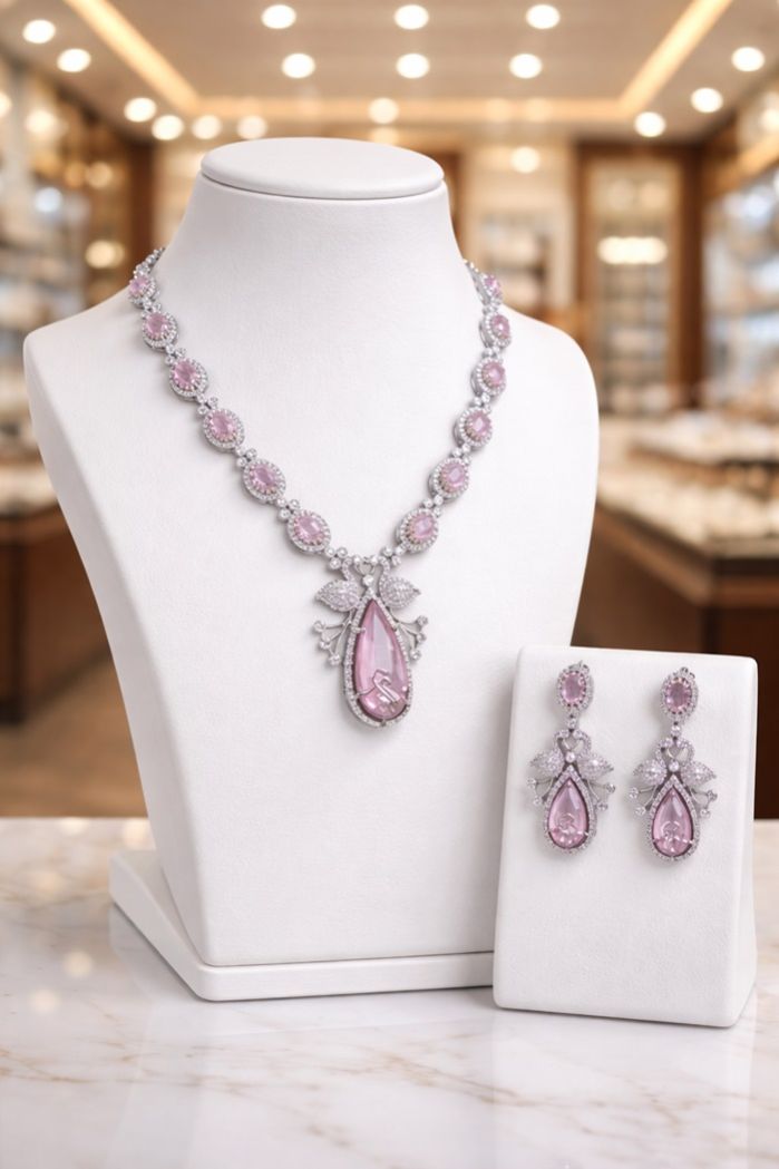 A graceful blush-pink necklace set with delicate petal detailing and diamond-look sparkle for soft, timeless elegance.