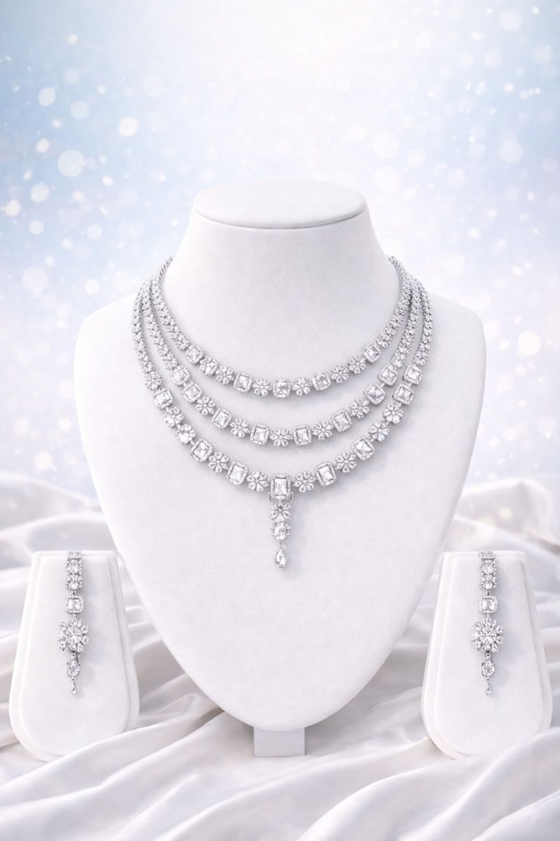 The Blushé Trio Blush Pink Necklace Set features a premium three-layer design accented with soft pink stones and diamond-look brilliance. Ideal for wedding functions, engagement parties, reception wear, and luxury gifting. Complements pastel outfits, gowns, sarees, and contemporary ethnic ensembles.