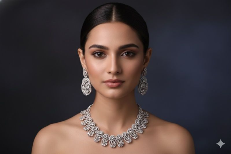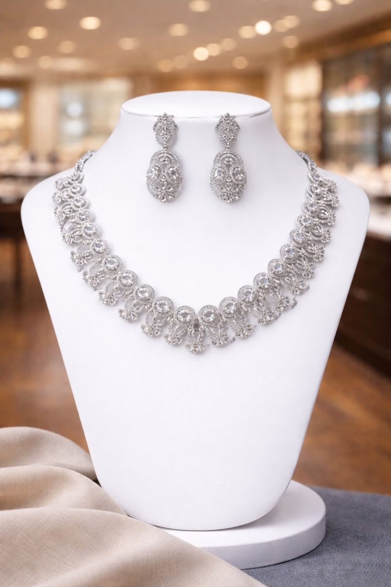 Ideal for searches such as diamond lace necklace, filigree jewelry set, handcrafted bridal necklace, luxury silver tone necklace for women, and elegant reception wear jewelry. A versatile design that pairs beautifully with sarees, lehengas, and contemporary ethnic outfits.