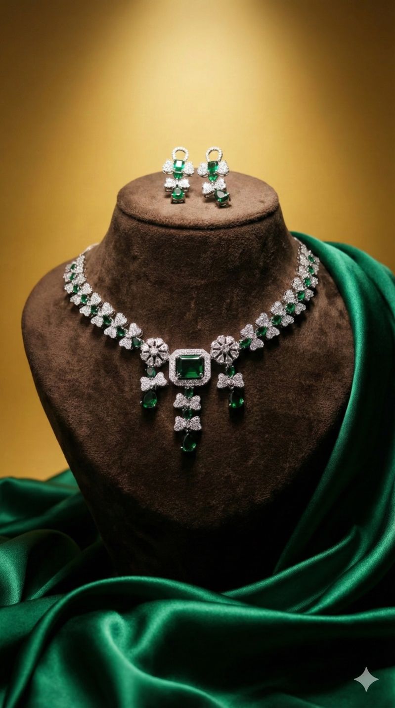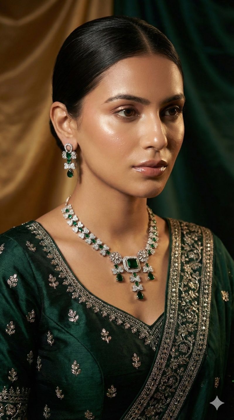 Crafted using premium plating and precision-set stones, the set offers long-lasting shine and comfortable wear throughout day-long celebrations. Its deep emerald hue pairs exquisitely with sarees, lehengas, gowns, and bespoke bridal outfits—making it an ideal choice for weddings, receptions, engagements, and festive ceremonies.