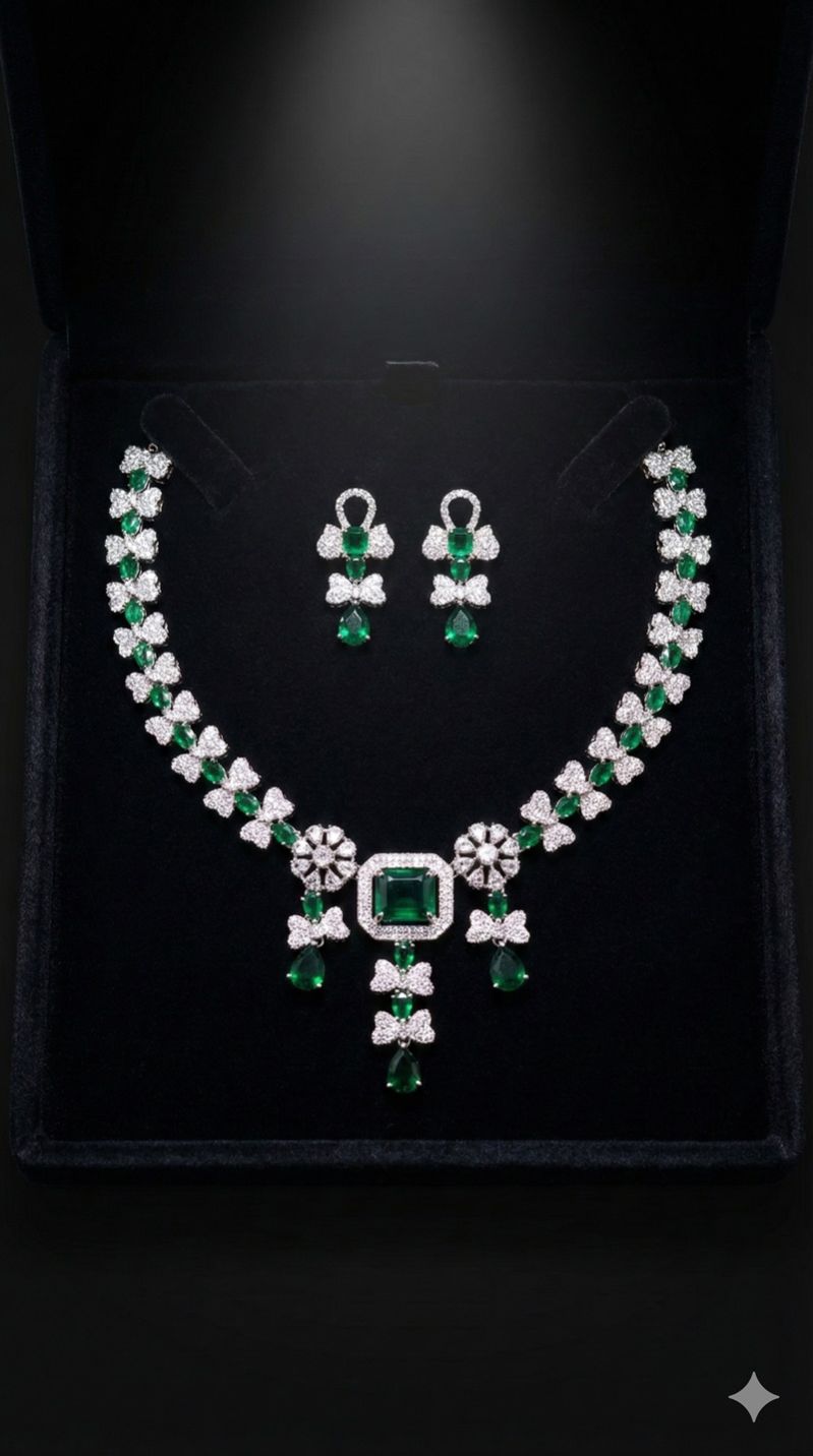 The Emerald Bloom Royale Set blends timeless elegance with exquisite craftsmanship. Designed with vibrant emerald stones framed by brilliant American Diamonds, this necklace showcases an intricate floral motif that highlights the neckline with unmatched grace. The statement pendant and drop detailing add a royal touch, while the matching earrings complete the set with perfect symmetry and brilliance.