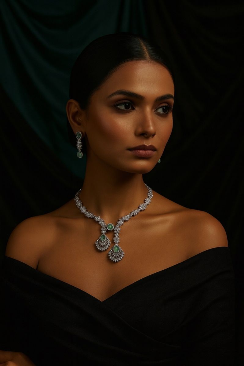 A graceful emerald-toned necklace set with fine AD detailing and elegant drop accents. Lightweight, refined, and perfect for weddings, festive occasions, and evening elegance.