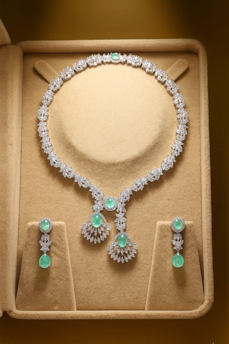 The Emerald Mist Elegance Set captures the charm of modern luxury with its soft green stones framed by sparkling American Diamonds. The necklace features intricate floral craftsmanship and delicate drop accents that create a beautifully refined silhouette. Paired with matching earrings, this set adds a subtle yet sophisticated glow to every outfit.