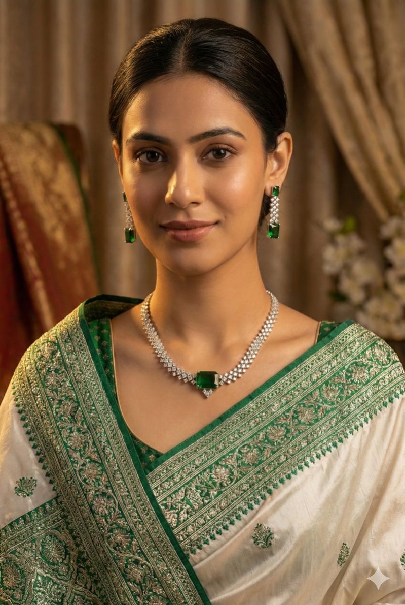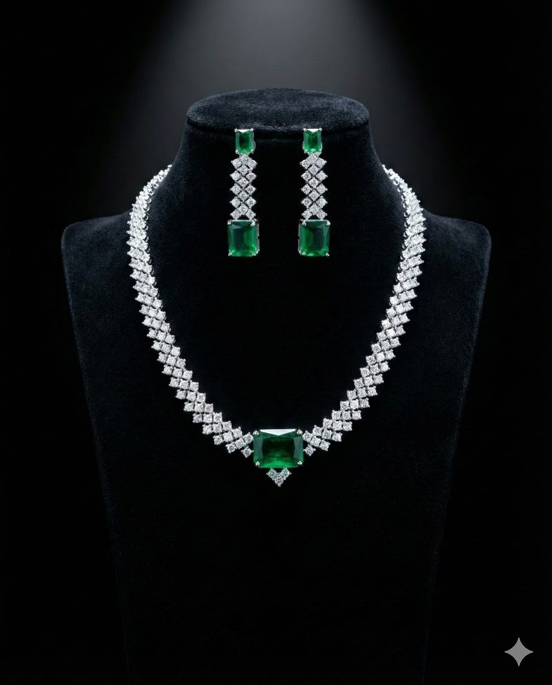The Emerald Radiance Solitaire Necklace Set is designed for women who appreciate clean, modern luxury. Featuring striking rectangular emerald-toned stones framed by brilliant American Diamonds, this set delivers a sophisticated, high-shine look without overwhelming the outfit. The finely crafted AD chain adds a graceful sparkle, while the matching earrings complete the ensemble with balanced elegance.