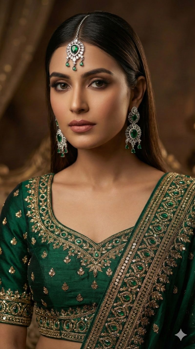 The Emerald Royale Bridal Tikka & Earrings Set is designed for brides who want a regal, statement-making look. Featuring rich emerald-green stones framed with high-shine American Diamonds, this set combines intricate detailing with a graceful silhouette. The maang tikka showcases a bold central emerald drop with beautifully arranged AD stones, while the matching earrings mirror the same artistry for a balanced and elegant finish.