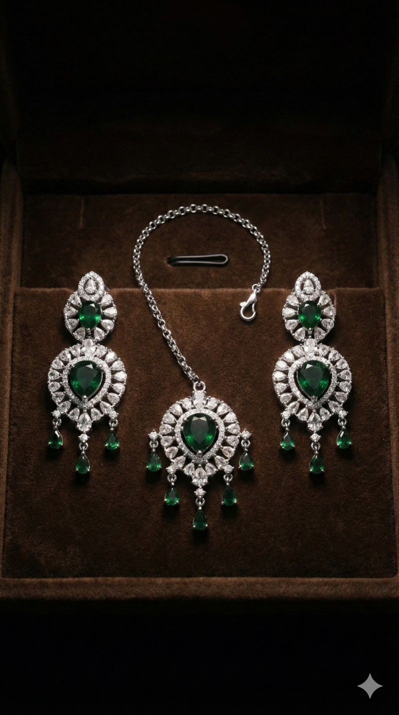 A luxurious emerald-stone bridal maang tikka and earrings set crafted with sparkling American Diamonds. Perfect for weddings, engagements, and festive ceremonies with a royal, timeless charm.