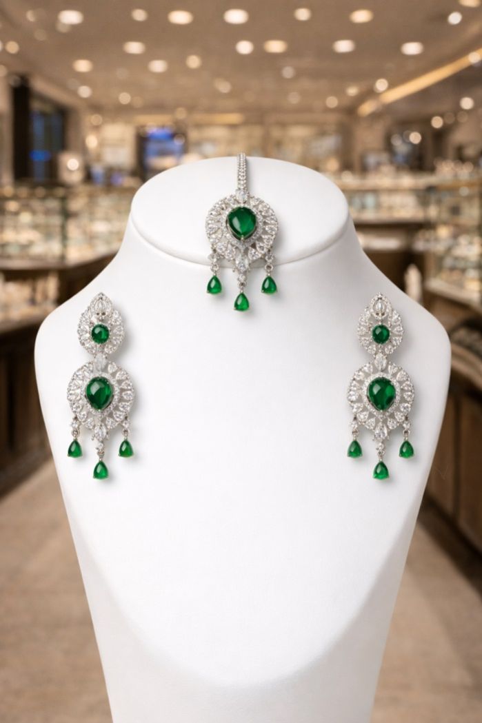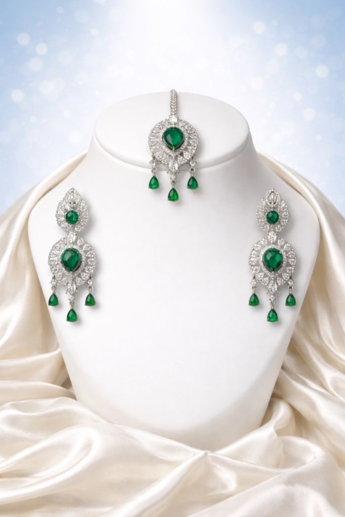 A luxurious emerald-stone bridal maang tikka and earrings set crafted with sparkling American Diamonds. Perfect for weddings, engagements, and festive ceremonies with a royal, timeless charm.