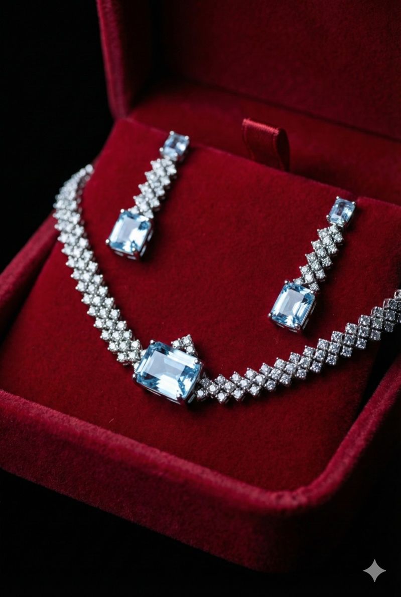 The Ice Blue Solitaire Elegance Necklace Set embodies minimal luxury with its cool-toned blue stone centerpiece framed by brilliant American Diamonds. Designed with a fine AD chain that radiates soft sparkle, this necklace offers a refined and modern look suitable for both special occasions and sophisticated evening events. The matching earrings mirror the solitaire charm, completing a balanced, effortlessly elegant set.