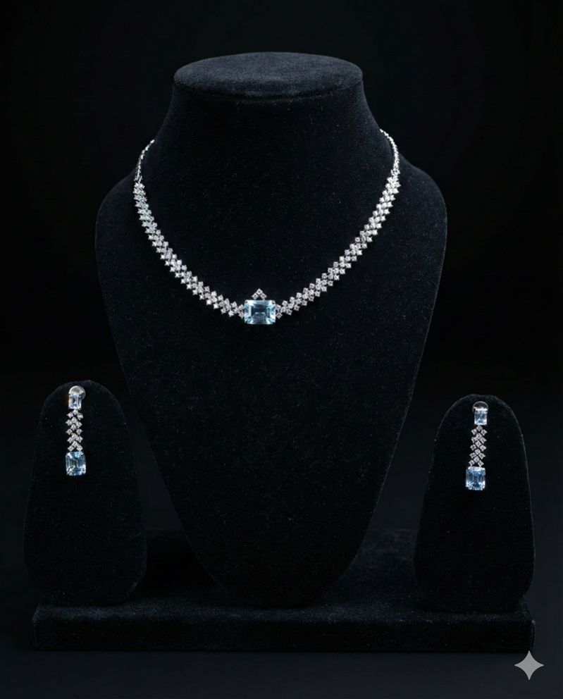 A sleek ice-blue solitaire necklace set crafted with a shimmering AD chain and matching drop earrings. Lightweight, elegant, and perfect for festive, bridal, and evening wear.