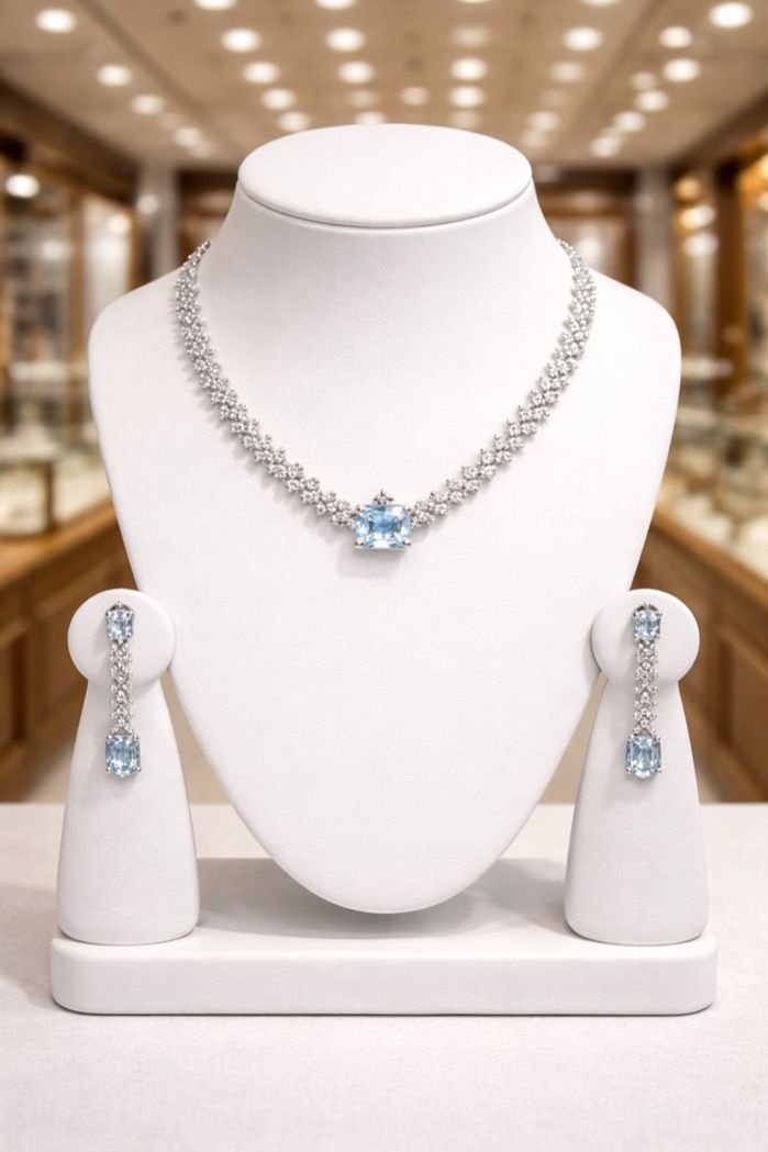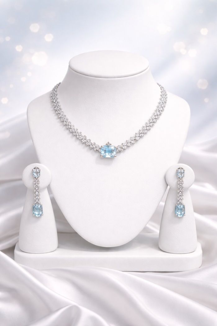 A sleek ice-blue solitaire necklace set crafted with a shimmering AD chain and matching drop earrings. Lightweight, elegant, and perfect for festive, bridal, and evening wear.