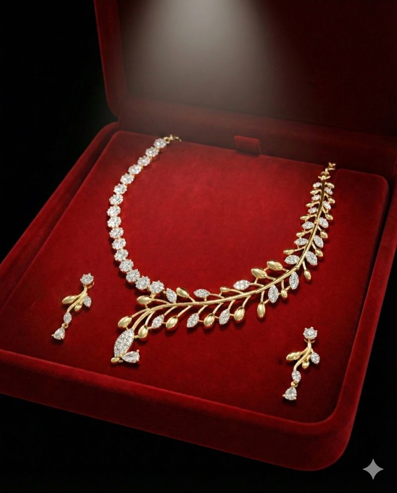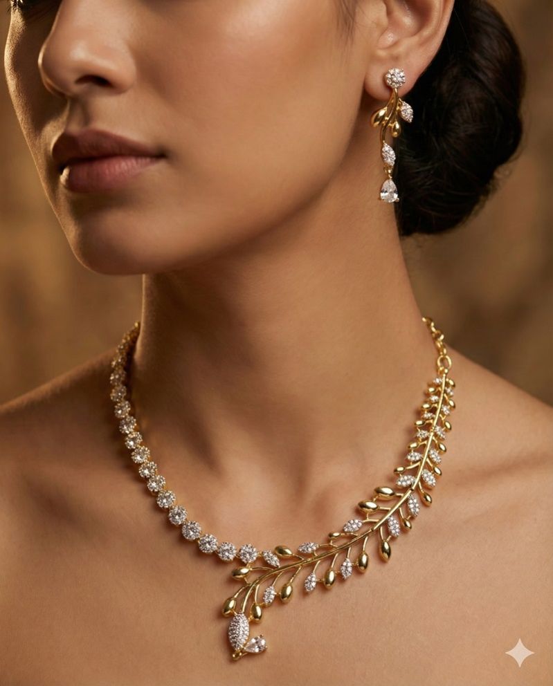 A beautifully crafted gold-polished leaf-pattern necklace set adorned with sparkling American Diamonds. Lightweight, elegant, and perfect for festive, party, and wedding occasions.