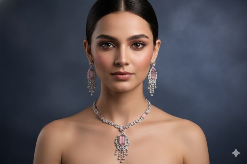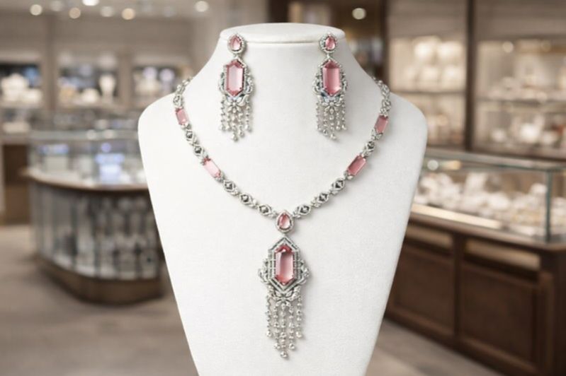 Perfect for searches such as pink diamond necklace set, vintage bridal jewelry, statement pendant necklace for weddings, luxury designer necklace set, and elegant evening jewelry for women. Designed to complement lehengas, sarees, gowns, and pastel bridal looks.