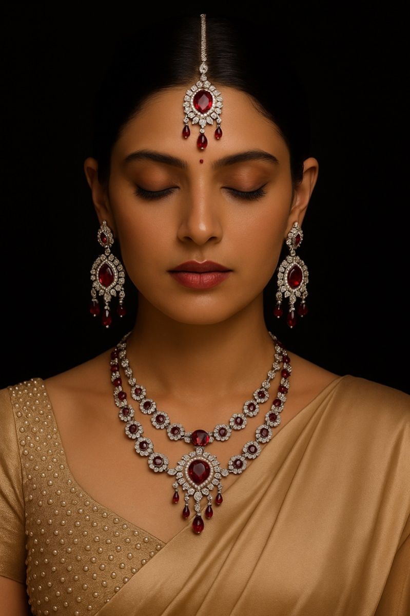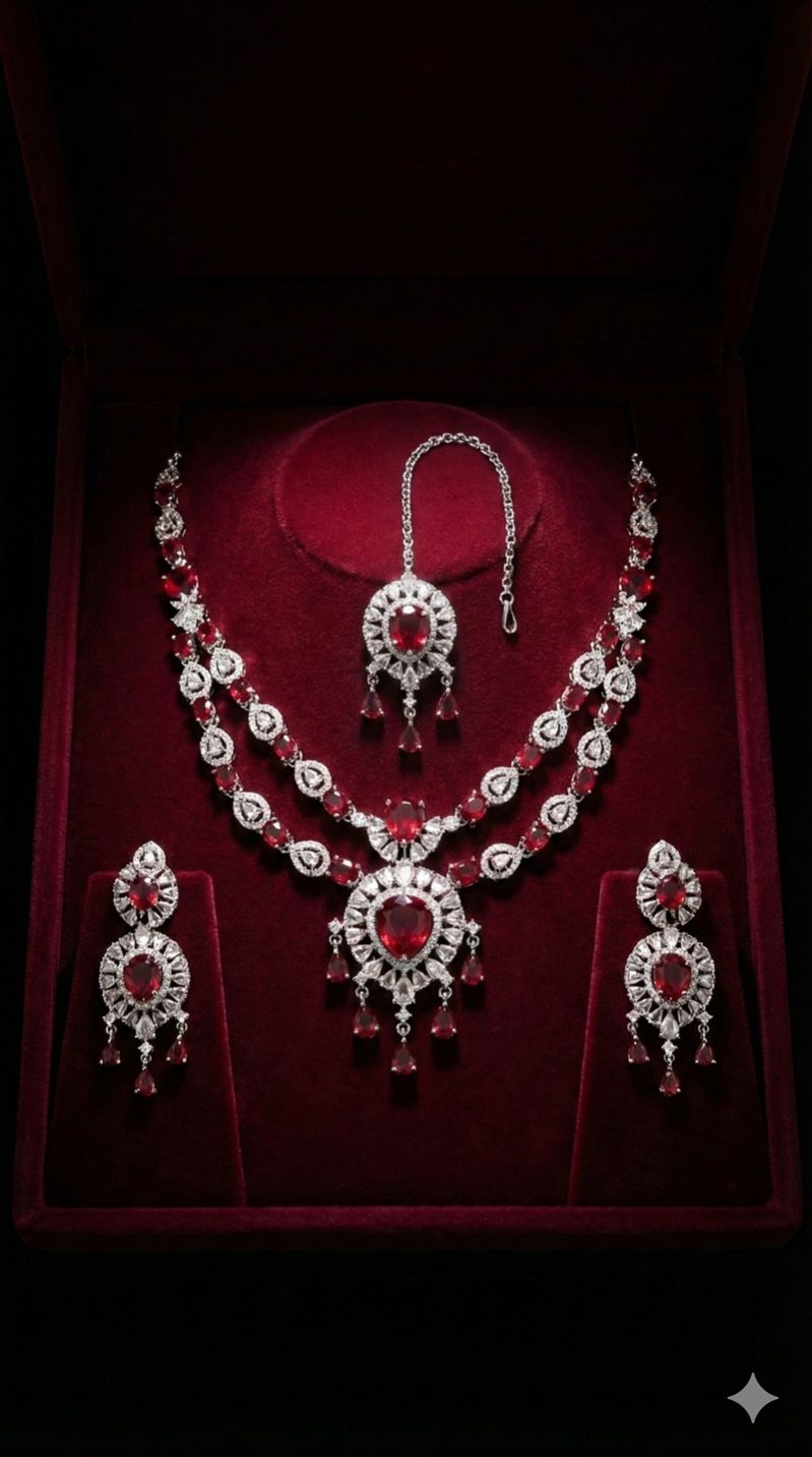 The Ruby Royal Heirloom Set embodies timeless elegance with its rich ruby-red stones and intricate American Diamond craftsmanship. The double-layer necklace highlights a bold heart-cut ruby centerpiece, enhanced with shimmering AD motifs that create a beautifully balanced, luxurious silhouette. The matching long earrings and statement maang tikka complete the ensemble with a glowing, heritage-inspired charm.