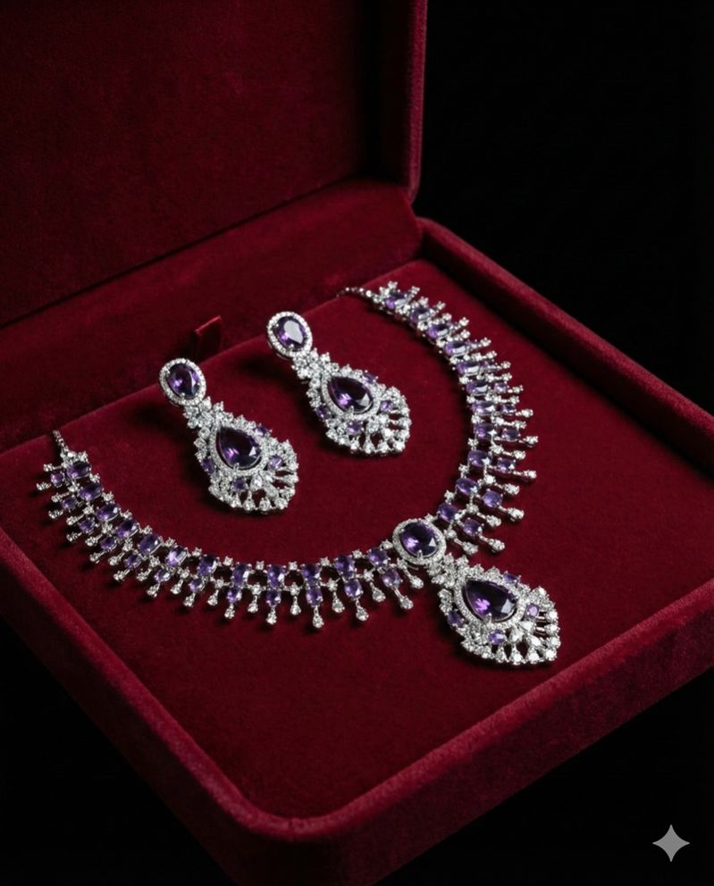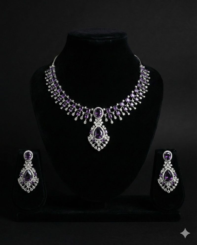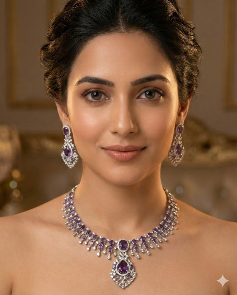 Lightweight yet visibly rich, the set is finished with high-quality plating and durable stone settings that ensure long-lasting shine. The cool violet tones combine effortlessly with sarees, lehengas, gowns, and Indo-western outfits, making this piece ideal for weddings, receptions, festive celebrations, and special evening occasions.