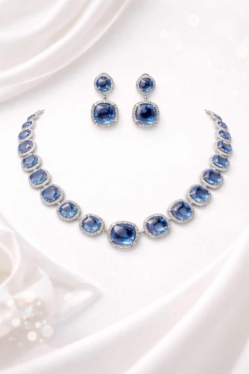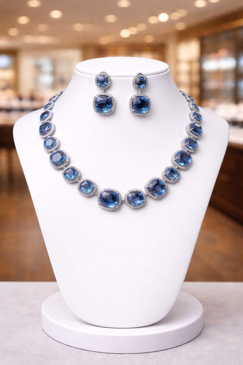 Discover the elegance of the Azura Halo Sapphire Necklace Set, a luxury jewelry piece crafted with rich blue sapphire-toned stones and precision diamond-look halo detailing. This designer necklace set is perfect for weddings, receptions, cocktail parties, and evening occasions.