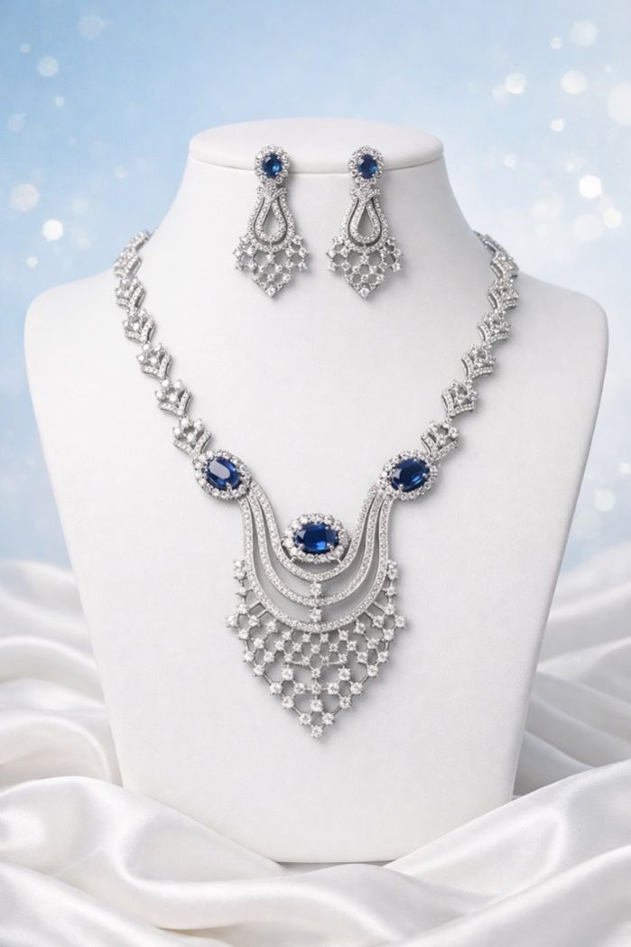 The Azure Arc Necklace Set is a refined expression of timeless elegance, designed for women who appreciate understated luxury. Featuring deep blue sapphire stones framed within intricate diamond-inspired detailing, this necklace creates a fluid, cascading silhouette that sits beautifully on the neckline.
