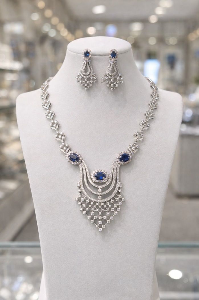 A graceful blue sapphire necklace set featuring layered curves and fine diamond detailing, crafted to elevate elegant evening and bridal looks.