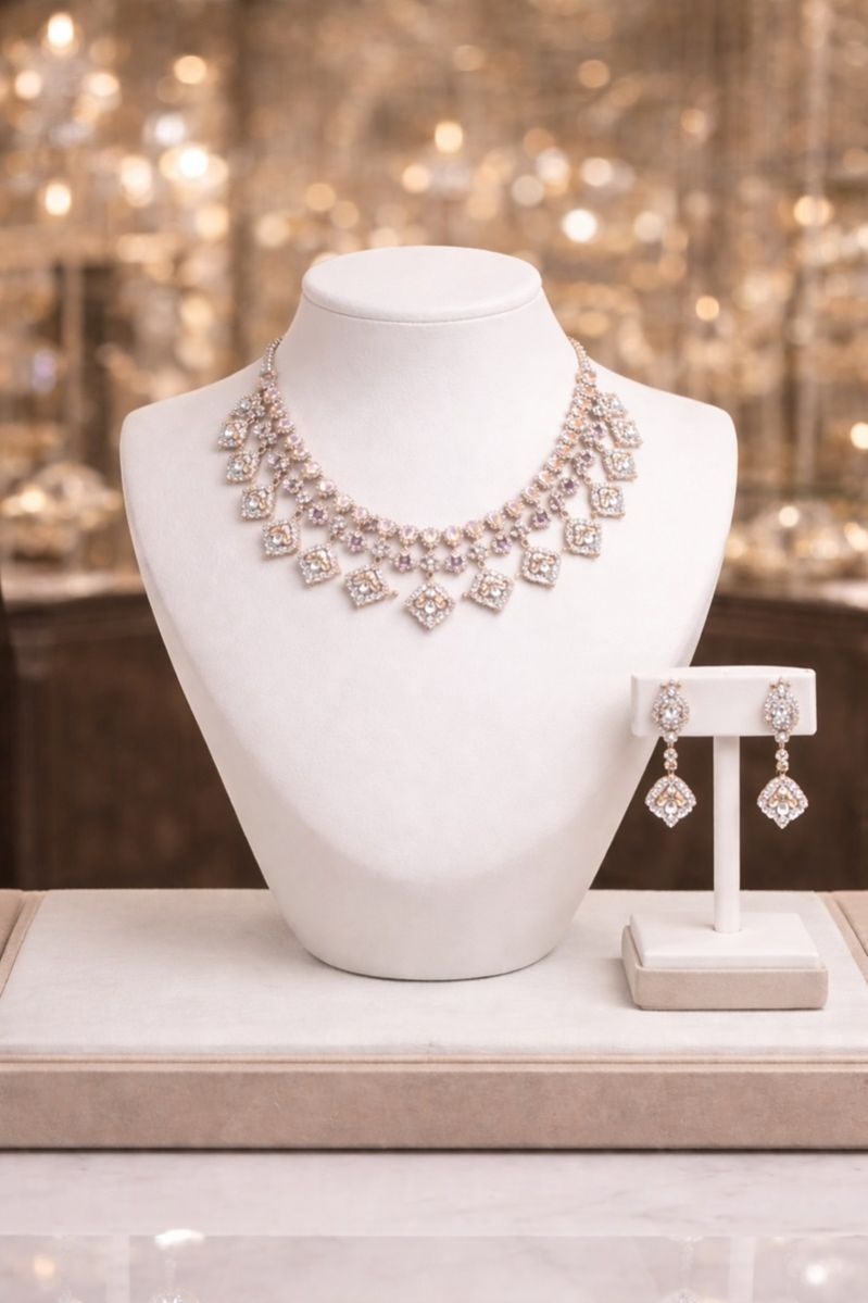 The Blushé Liora Necklace Set showcases peach-pink stones paired with ornate silver-finish craftsmanship and coordinated earrings. Ideal for bridal wear, engagement ceremonies, festive occasions, and luxury ethnic ensembles. Perfectly complements pastel sarees, lehengas, and elegant evening outfits.