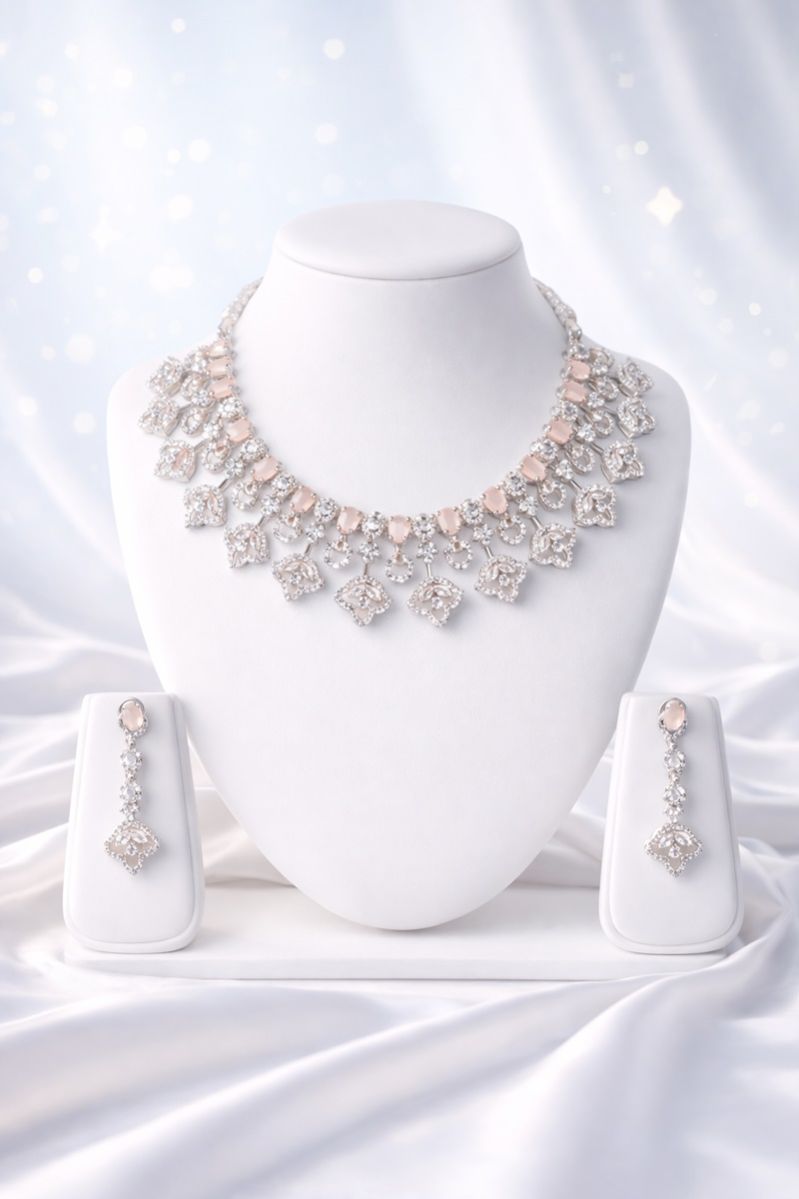 A refined blush-stone necklace set with delicate silver craftsmanship and graceful drops.