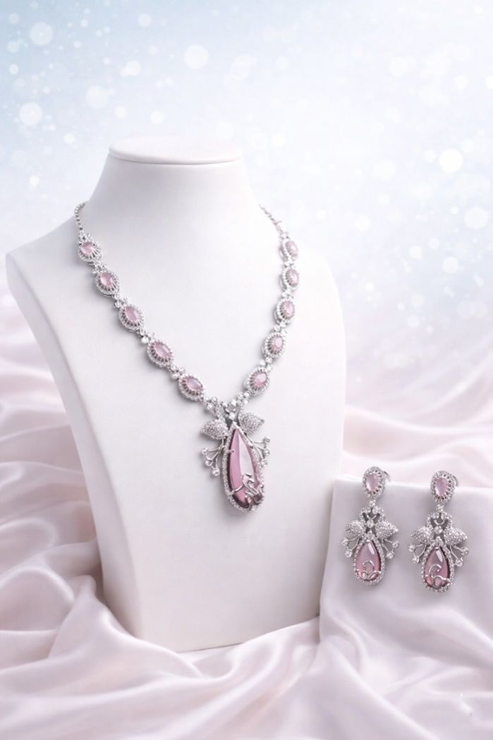 A graceful blush-pink necklace set with delicate petal detailing and diamond-look sparkle for soft, timeless elegance.