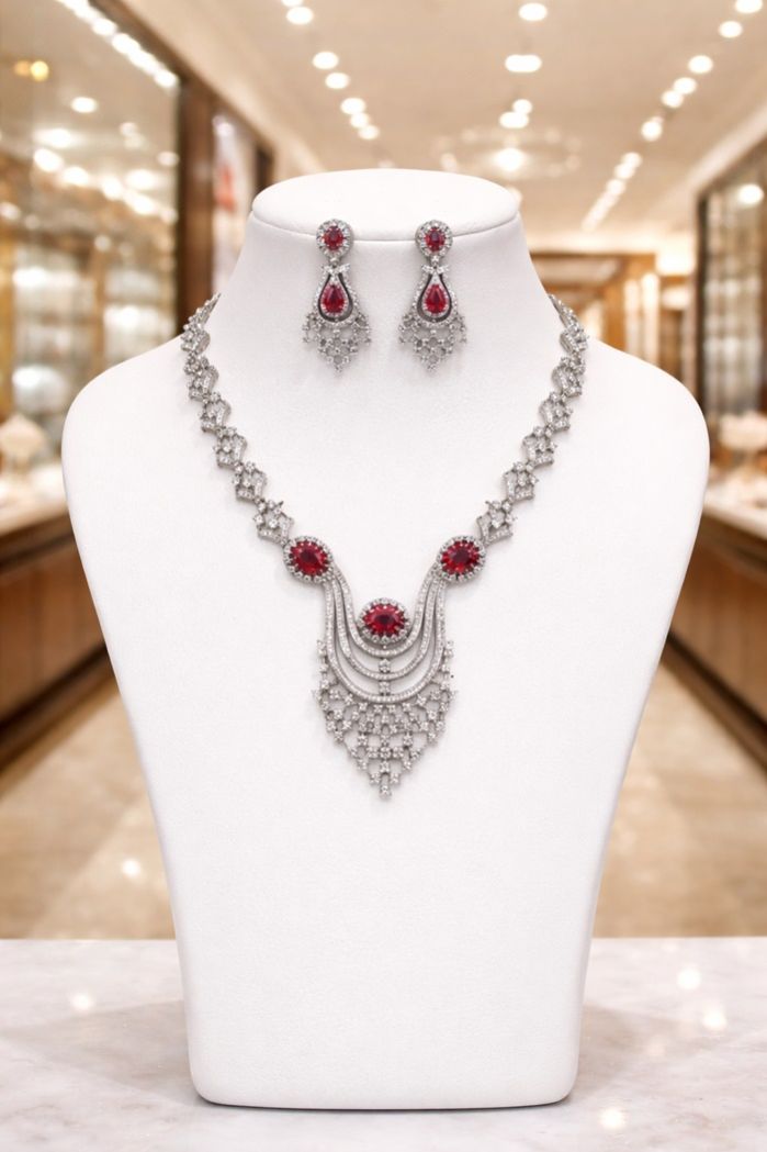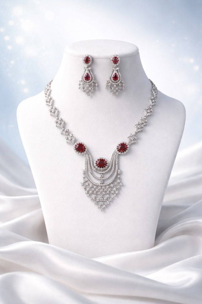 Introducing the Crimson Arc Necklace Set, a bold expression of elegance crafted for women who appreciate timeless luxury with a modern silhouette. Designed with the iconic Arc-inspired curves, this necklace set showcases deep crimson ruby-toned centre stones framed by finely set diamond-look accents, creating a harmonious blend of brilliance and grace.
