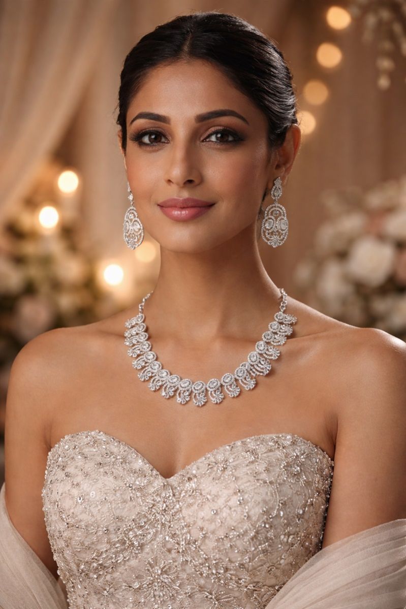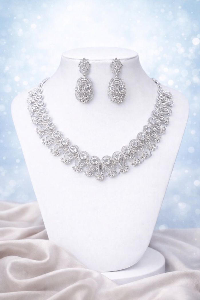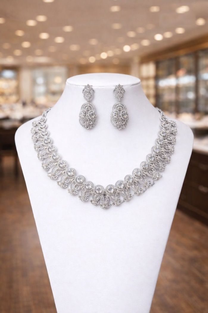 Ideal for searches such as diamond lace necklace, filigree jewelry set, handcrafted bridal necklace, luxury silver tone necklace for women, and elegant reception wear jewelry. A versatile design that pairs beautifully with sarees, lehengas, and contemporary ethnic outfits.