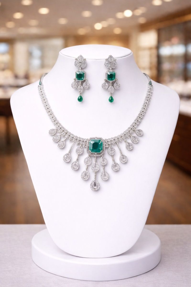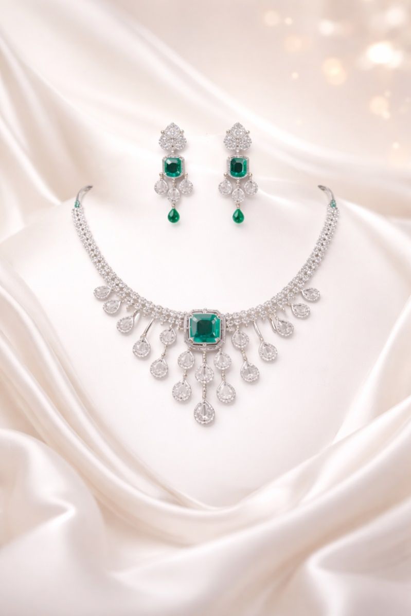 This elegant emerald necklace set pairs beautifully with lehengas, sarees, gowns, and evening wear. A perfect choice for customers searching for emerald bridal necklace, chandelier diamond look jewelry, reception wear necklace set, luxury statement necklace, and designer wedding jewelry for women.