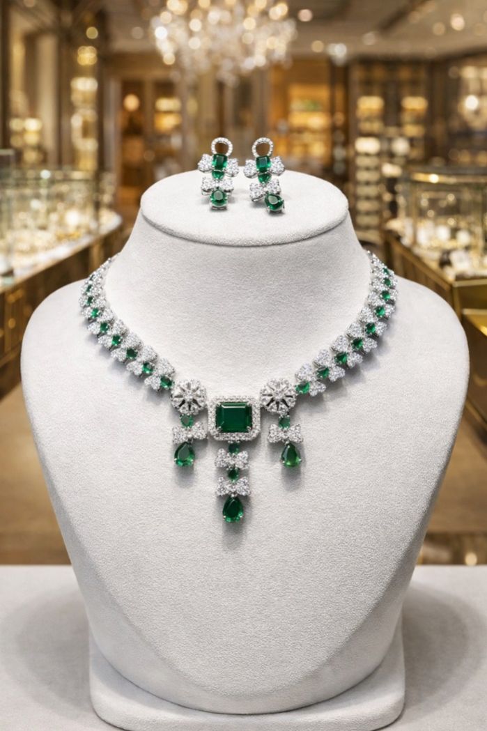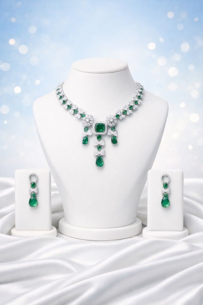 The Emerald Bloom Royale Set blends timeless elegance with exquisite craftsmanship. Designed with vibrant emerald stones framed by brilliant American Diamonds, this necklace showcases an intricate floral motif that highlights the neckline with unmatched grace. The statement pendant and drop detailing add a royal touch, while the matching earrings complete the set with perfect symmetry and brilliance.
