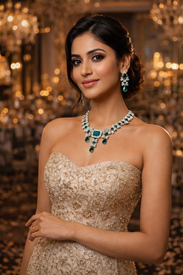 Crafted using premium plating and precision-set stones, the set offers long-lasting shine and comfortable wear throughout day-long celebrations. Its deep emerald hue pairs exquisitely with sarees, lehengas, gowns, and bespoke bridal outfits—making it an ideal choice for weddings, receptions, engagements, and festive ceremonies.