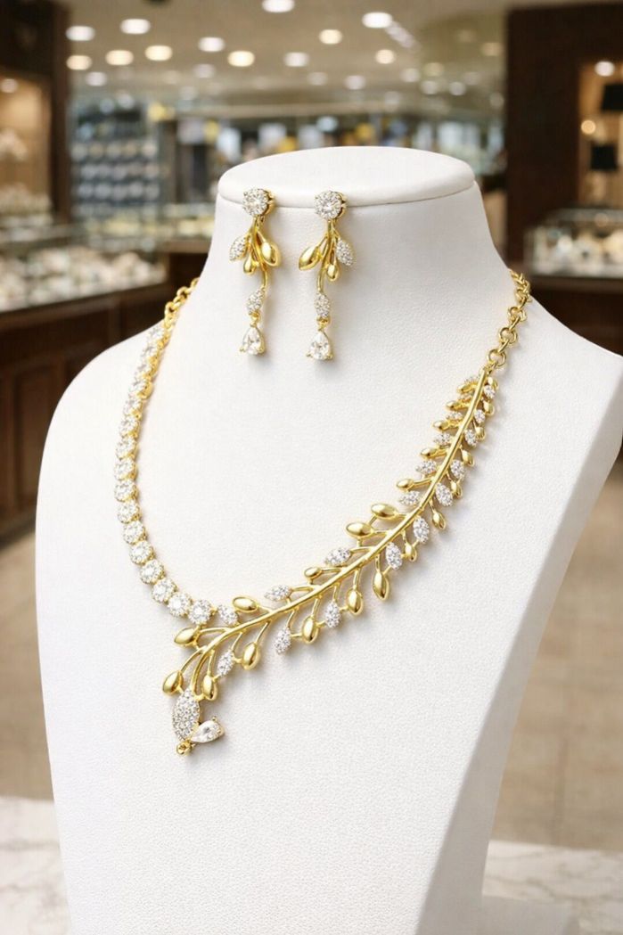 A beautifully crafted gold-polished leaf-pattern necklace set adorned with sparkling American Diamonds. Lightweight, elegant, and perfect for festive, party, and wedding occasions.