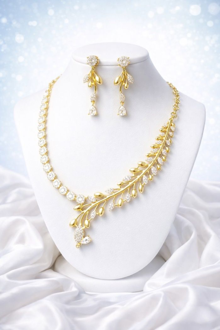 The Golden Leaf Luxe Necklace Set blends contemporary elegance with fine craftsmanship. Featuring a graceful leaf-inspired design finished in premium gold polish, this set is embellished with precision-cut American Diamonds that add a soft, refined sparkle. Its lightweight construction ensures all-day comfort, while the matching earrings complete the look with subtle sophistication.