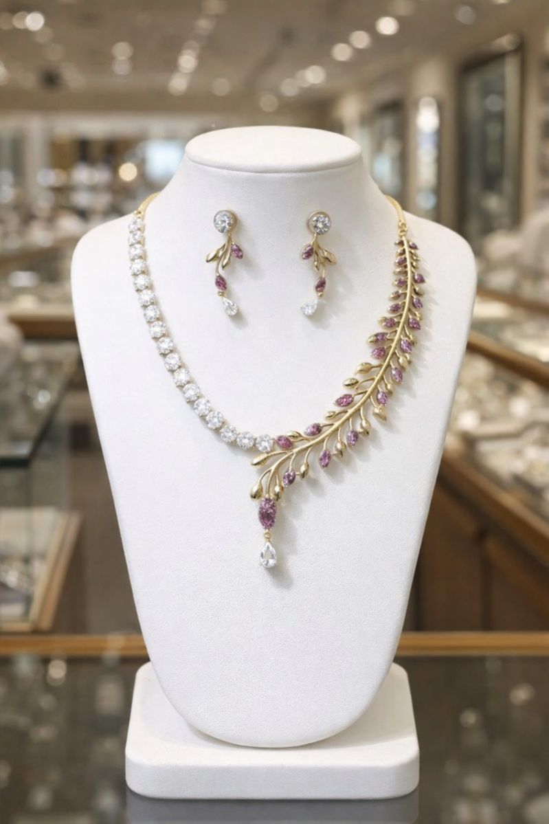 Optimized for searches such as designer floral necklace set, pink stone bridal jewelry, diamond look wedding necklace, luxury fashion jewelry for women, and reception wear necklace set.