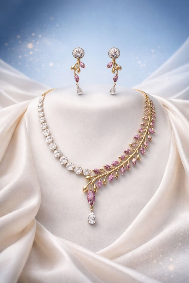 Discover refined elegance with the Liréva Bloom Designer Necklace Set, featuring a floral vine pattern accented with pink stones and diamond-look brilliance. This luxury necklace set is ideal for bridal wear, wedding functions, receptions, engagement ceremonies, and festive occasions.