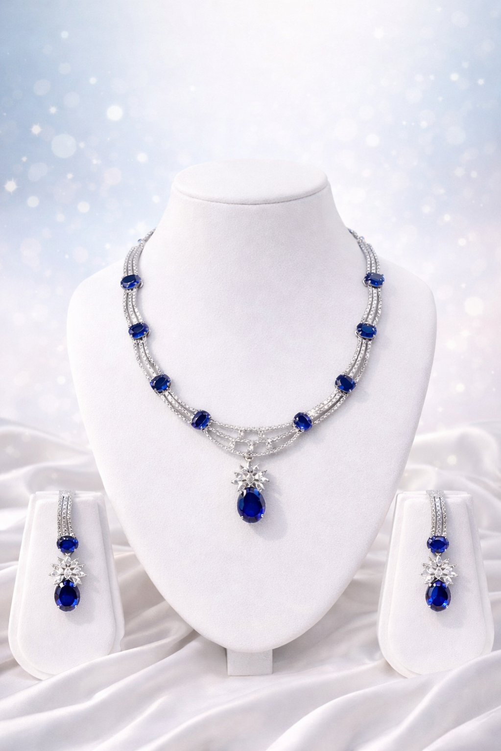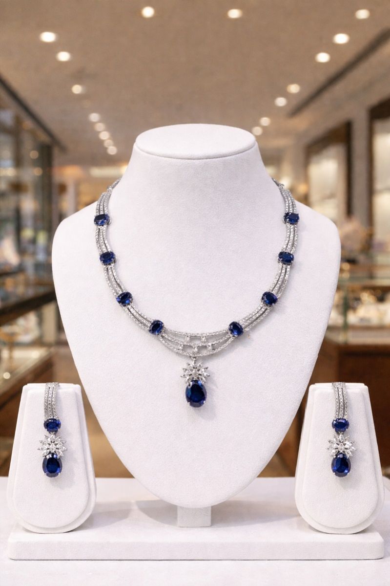 Optimized for searches like blue sapphire necklace set, luxury evening jewelry, designer party necklace, diamond look earrings set, and statement bridal accessories.