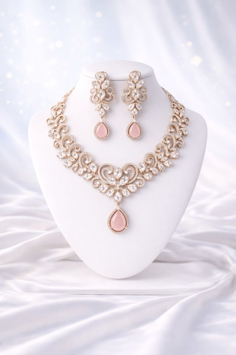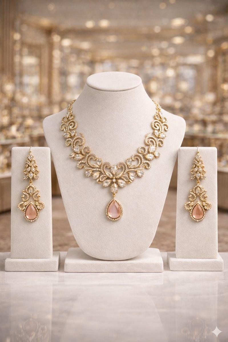 Optimized for searches including peach stone necklace set, rose gold bridal jewelry, designer drop necklace, luxury wedding earrings, and bridal statement jewelry set.