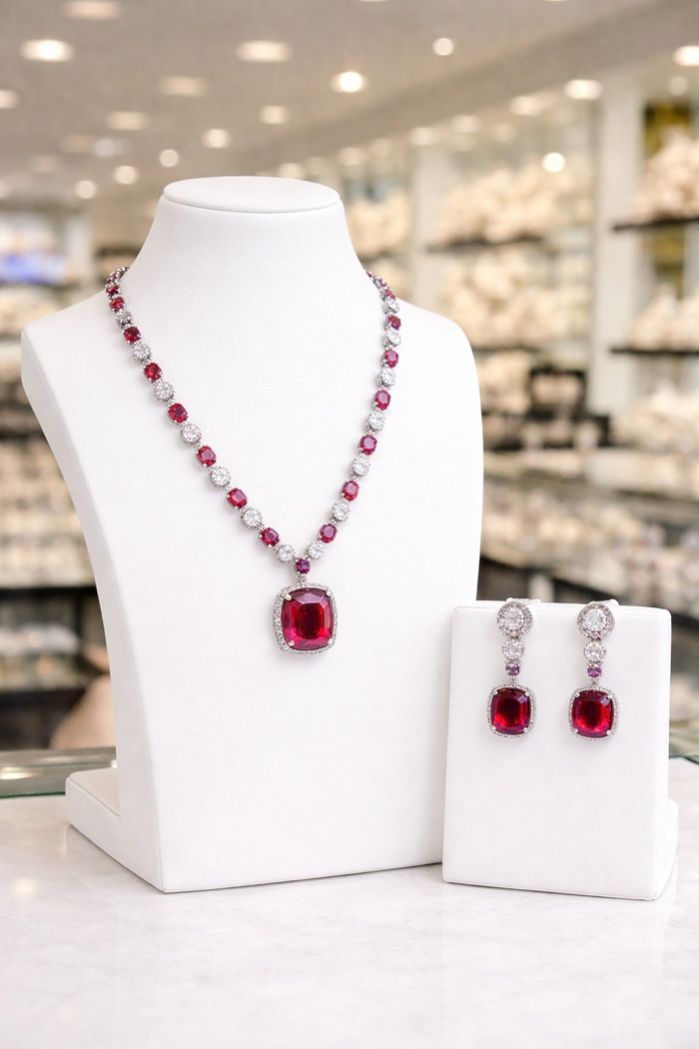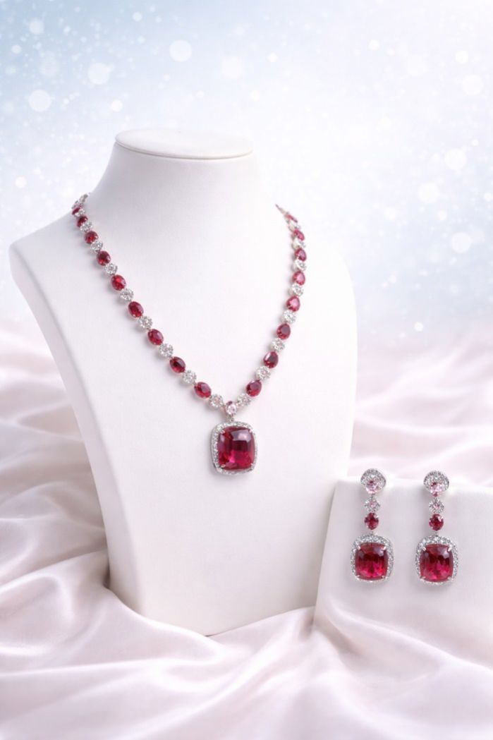 A refined ruby-pink drop necklace set accented with diamond-look detailing for graceful, timeless elegance.
