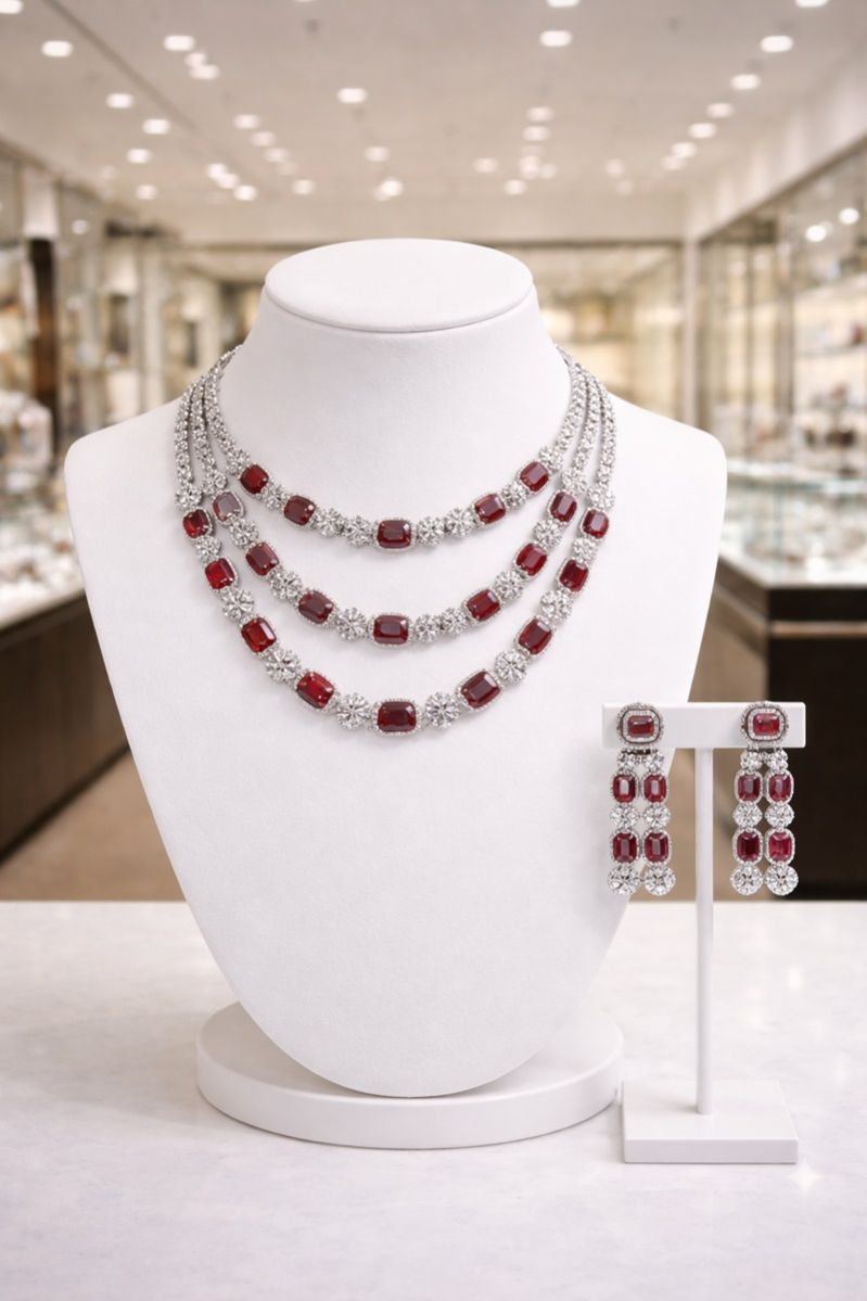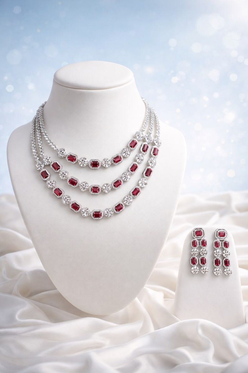 The Rubéon Tier Royale Necklace Set is a luxury layered ruby jewelry set featuring American diamonds and premium craftsmanship. Ideal for brides, weddings, receptions, and high-end festive occasions, this designer necklace offers a bold multi-layer silhouette with timeless appeal.
