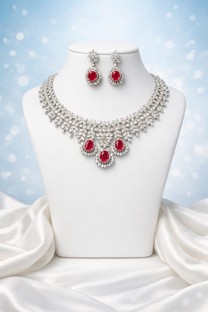 The Ruby Lume Necklace Set is crafted for those who prefer understated luxury over heavy bridal chokers. Featuring deep ruby-toned stones encased in shimmering American diamonds, this short-length necklace rests gracefully along the collarbone, enhancing the neckline without overpowering the look.