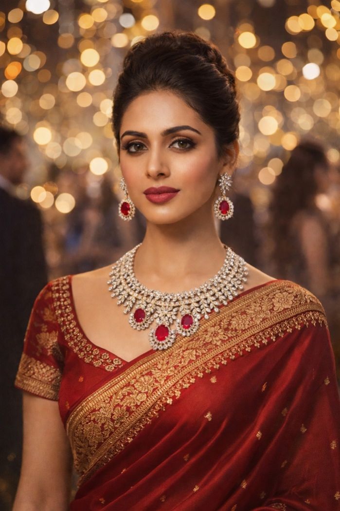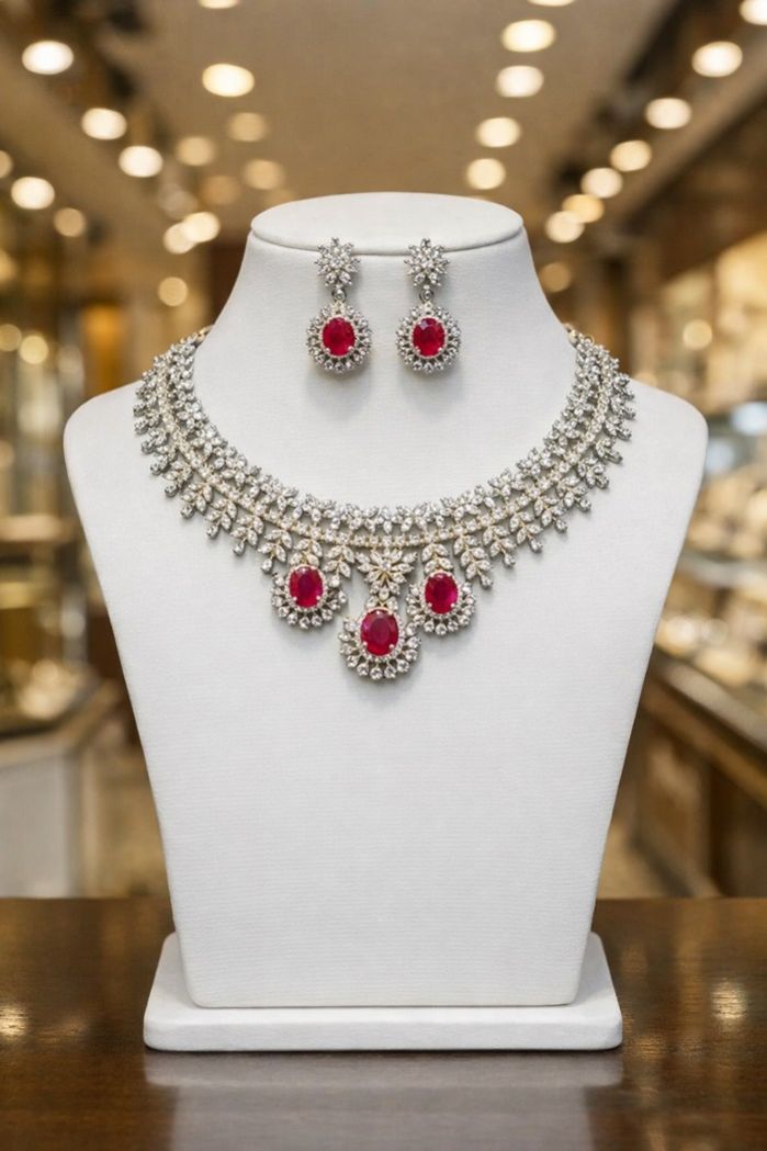 A refined short-length ruby diamond necklace designed to add effortless elegance to sarees and evening wear.