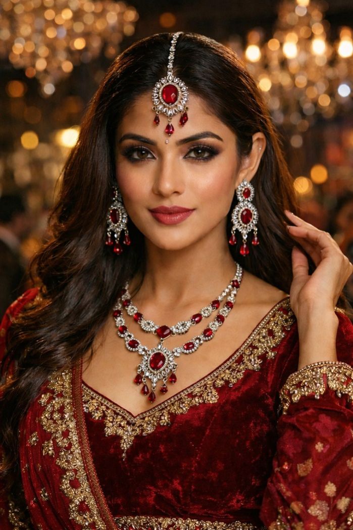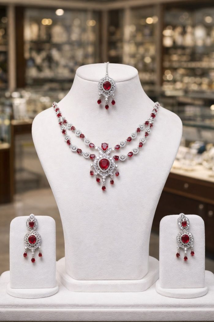 Designed with premium plating and precision-set stones, this set ensures brilliant shine and long-lasting comfort throughout your celebrations. Its deep ruby hue pairs perfectly with bridal lehengas, silk sarees, velvet ensembles, and grand festive attire — making it the ideal choice for weddings, receptions, sangeet nights, and high-fashion events.