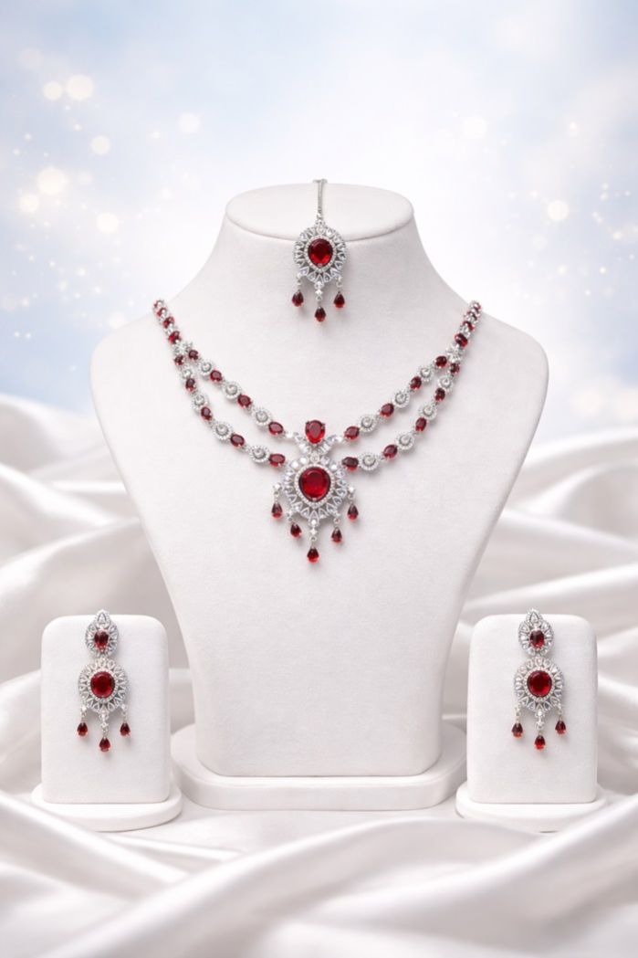 The Ruby Royal Heirloom Set embodies timeless elegance with its rich ruby-red stones and intricate American Diamond craftsmanship. The double-layer necklace highlights a bold heart-cut ruby centerpiece, enhanced with shimmering AD motifs that create a beautifully balanced, luxurious silhouette. The matching long earrings and statement maang tikka complete the ensemble with a glowing, heritage-inspired charm.