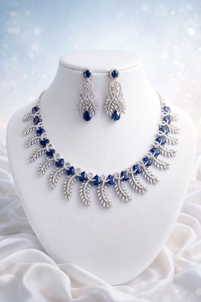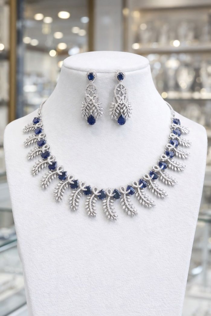 A sophisticated sapphire-blue necklace set crafted with leaf-inspired detailing and diamond-look brilliance for timeless elegance.