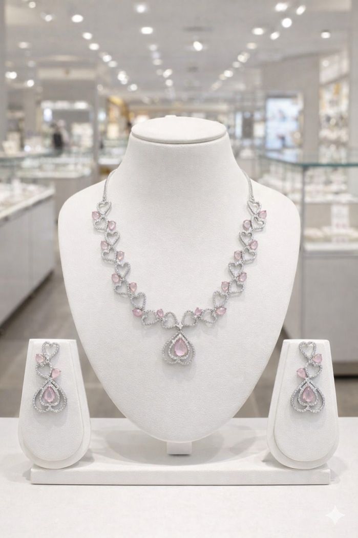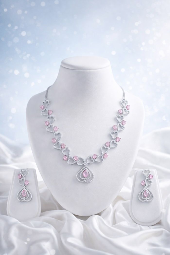 A graceful rose-pink necklace set framed with diamond-look detailing, designed for elegant romantic statements.