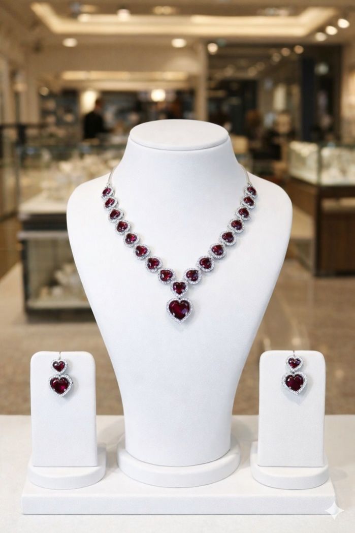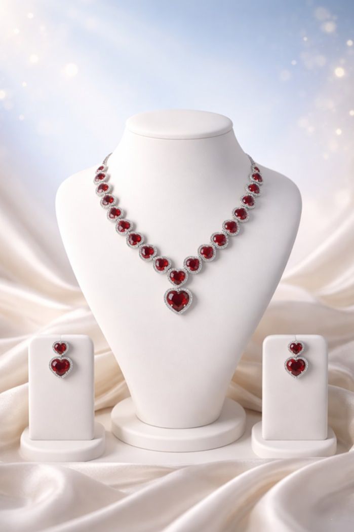 A bold ruby-red necklace set accented with diamond-look detailing, crafted for elegant statement occasions.