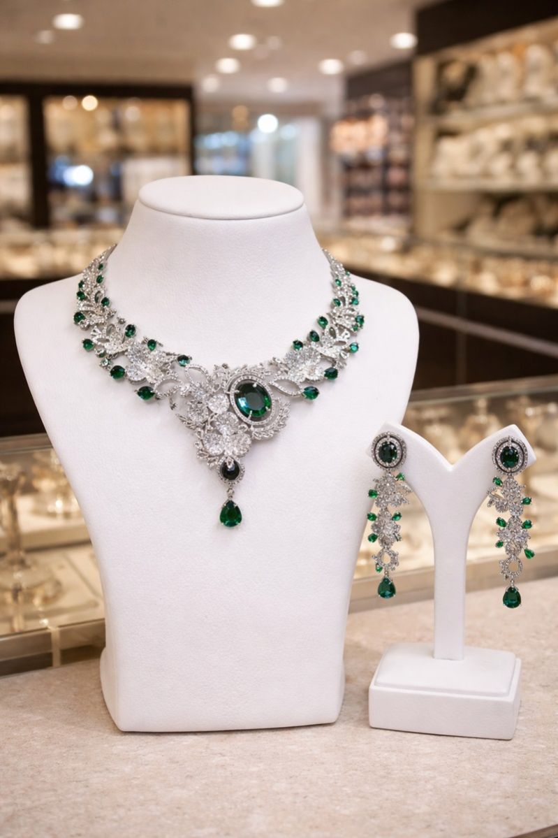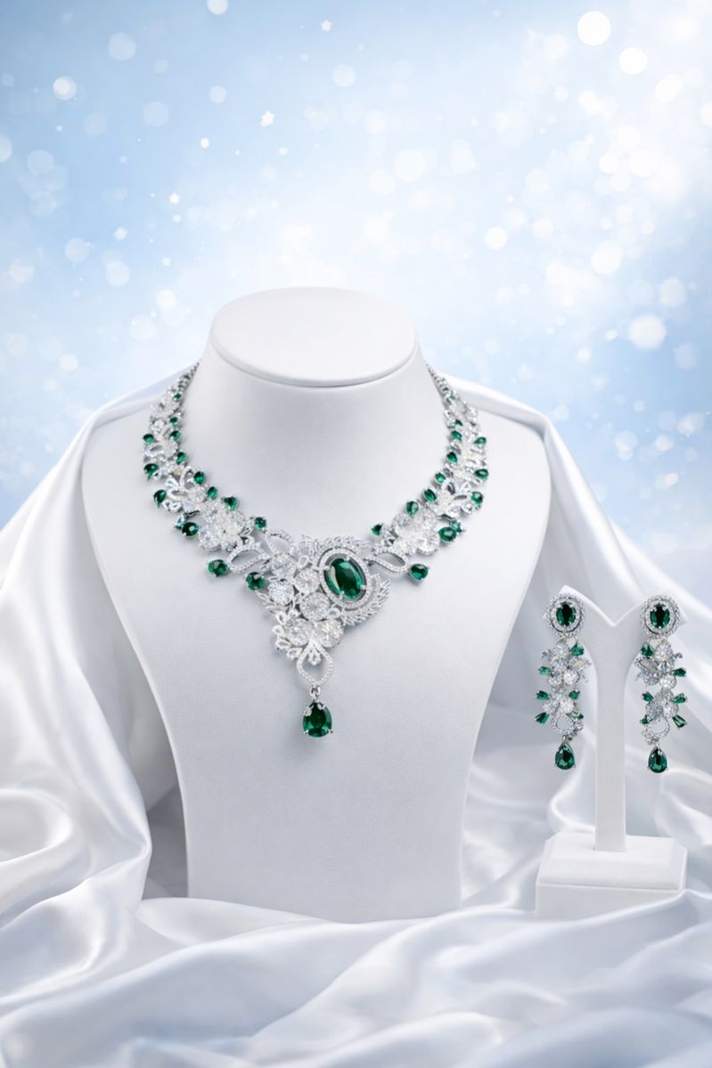 The Saphéa Verde Heirloom Emerald Green Necklace Set is a luxury designer jewelry piece featuring emerald-green stones with premium American diamond craftsmanship. Designed for bridal wear, wedding receptions, festive occasions, and royal celebrations, this elegant necklace set blends timeless heirloom aesthetics with modern refinement.