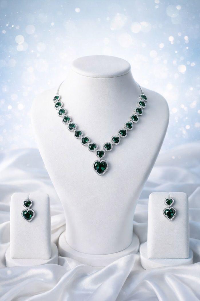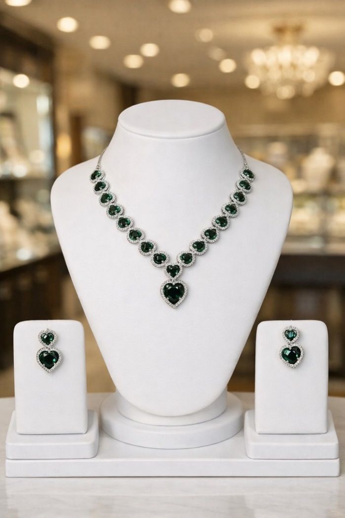 Its heart-inspired motif, refined silhouette, and rich sapphire colour make it an ideal choice for women seeking luxury party wear jewelry that stands out with grace. Suitable for ethnic and fusion outfits, this sapphire heart necklace set delivers timeless charm and understated glamour.