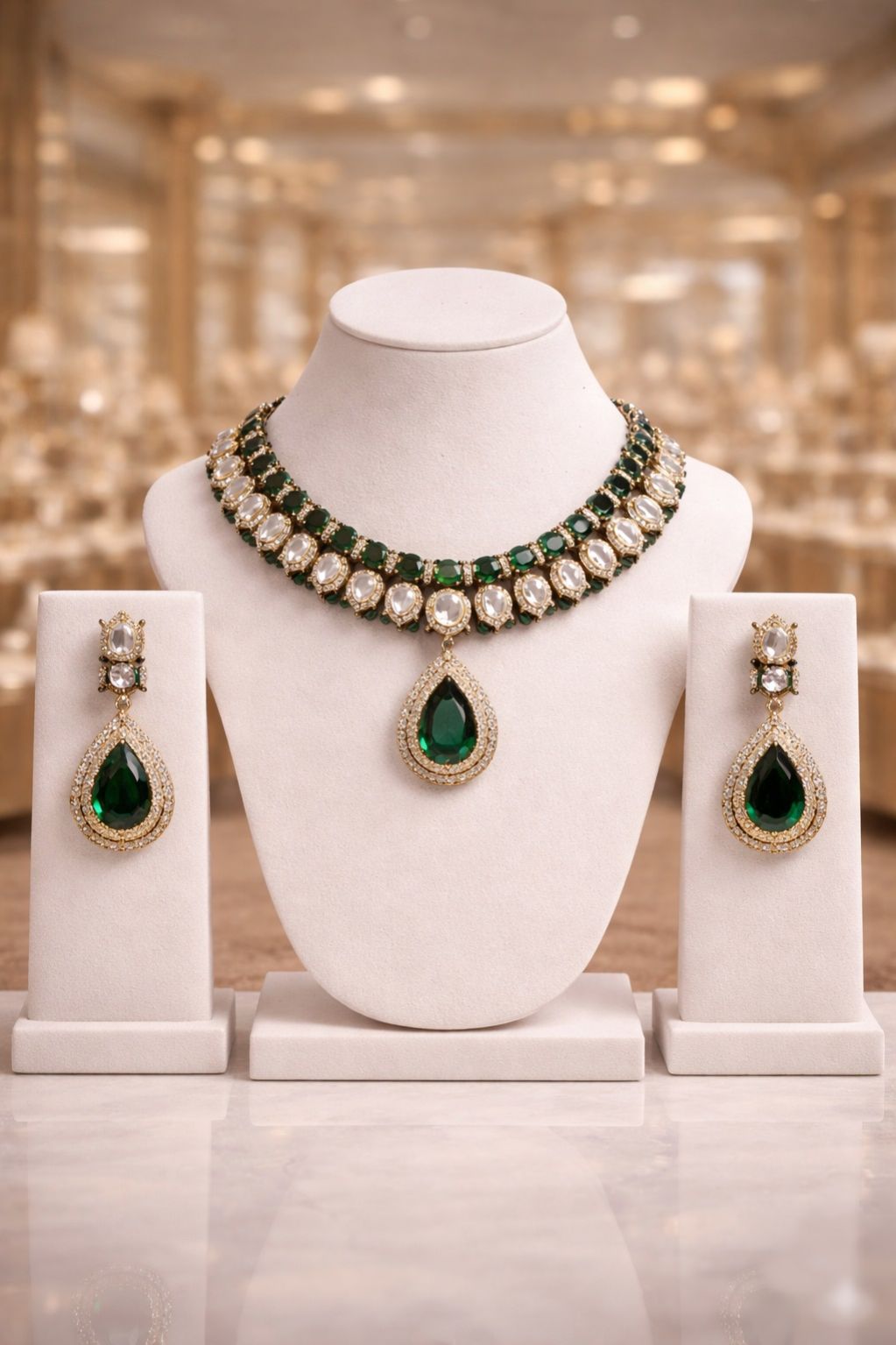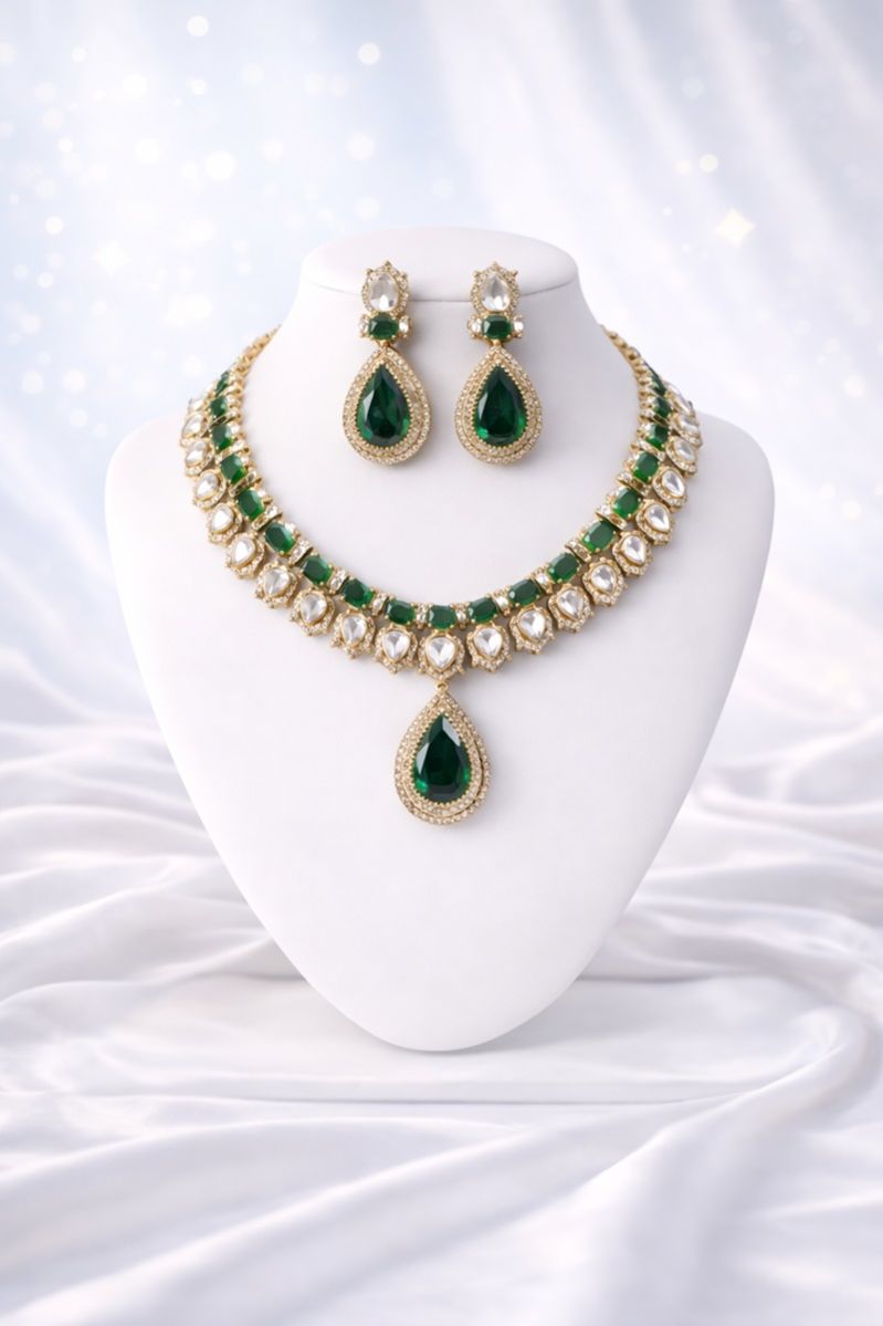 Optimized for searches like emerald necklace set, green stone bridal jewelry, gold finish necklace set, luxury wedding jewelry, designer emerald earrings, and royal diamond necklace set.