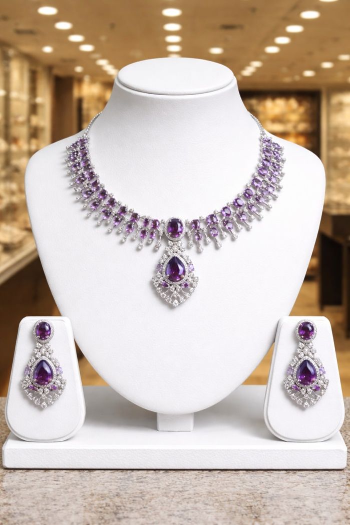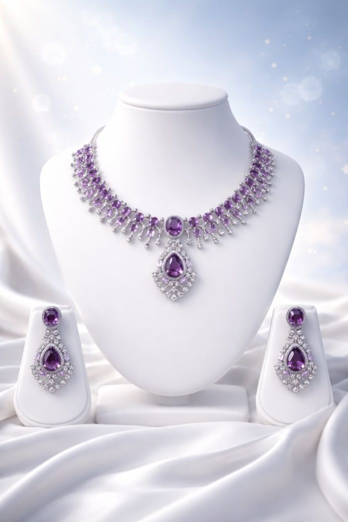 Lightweight yet visibly rich, the set is finished with high-quality plating and durable stone settings that ensure long-lasting shine. The cool violet tones combine effortlessly with sarees, lehengas, gowns, and Indo-western outfits, making this piece ideal for weddings, receptions, festive celebrations, and special evening occasions.